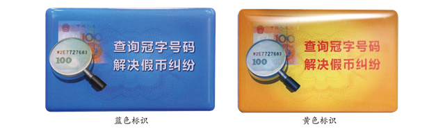 已實(shí)現(xiàn)冠字號(hào)碼查詢的現(xiàn)鈔支付終端(自動(dòng)柜員機(jī)、銀行柜臺(tái)),會(huì)張貼藍(lán)色或黃色冠字號(hào)碼可查詢標(biāo)識(shí)。張貼藍(lán)色標(biāo)識(shí)是指可實(shí)現(xiàn)取款業(yè)務(wù)信息與冠字號(hào)碼記錄的關(guān)聯(lián),能在假幣糾紛中向客戶提供取出現(xiàn)鈔的冠字號(hào)碼(文本及圖像信息),且提供的冠字號(hào)碼與現(xiàn)鈔能一一對(duì)應(yīng);張貼黃色標(biāo)識(shí)是指無法在假幣糾紛中一一對(duì)應(yīng)地向客戶提供取出現(xiàn)鈔的冠字號(hào)碼,但可提供業(yè)務(wù)發(fā)生當(dāng)天(或時(shí)段)該設(shè)備內(nèi)各鈔箱所有現(xiàn)鈔的冠字號(hào)碼(文本及圖像信息)或業(yè)務(wù)發(fā)生時(shí)段該柜臺(tái)取款現(xiàn)鈔的冠字號(hào)碼。