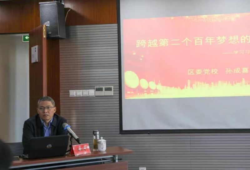 區(qū)委黨校副校長孫成喜講授《跨越第二個(gè)百年夢(mèng)想的政治宣言》黨課,帶領(lǐng)大家學(xué)習(xí)習(xí)近平“七一講話”精神蘊(yùn)含的時(shí)代背景和其中的重大理論創(chuàng)新,指出了“七一講話”精神對(duì)工作開展的指導(dǎo)作用。